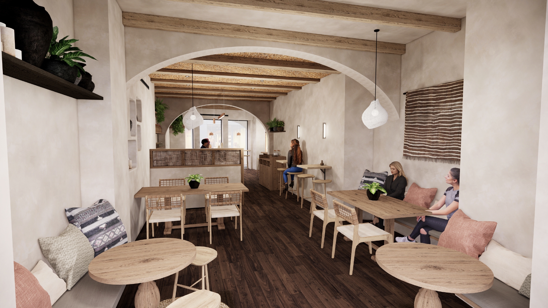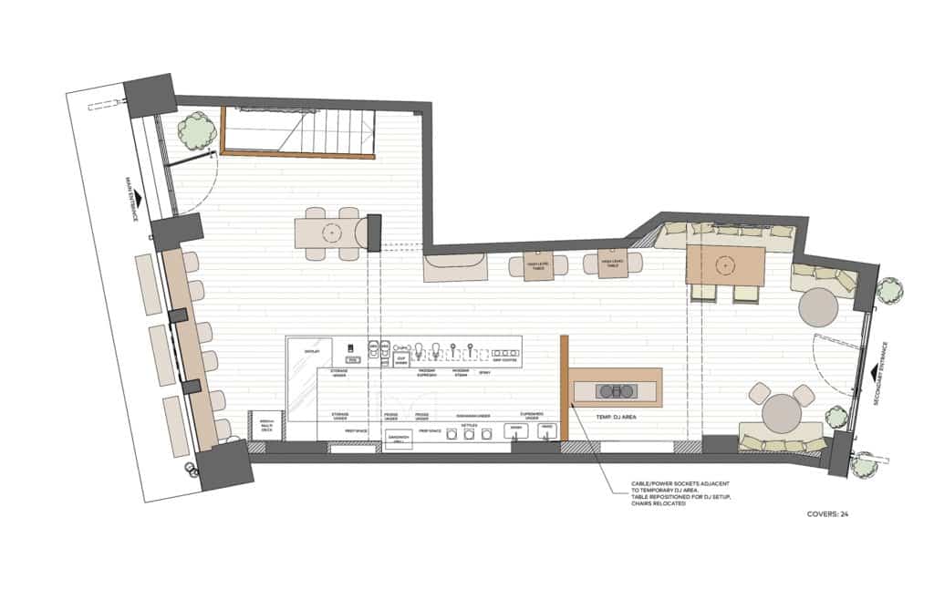 Utilising both aspects of the site with entrances from both Redchurch Street and Bethnal Green Road, the ground floor space hosts the speciality coffee bar counter with a landscape of seating for both dwell and more casual moments where in the evening a DJ booth appears. For the locals and those in the know, the lounge hideaway is waiting to be discovered in the basement where members can enjoy semi-private spaces for chilled house vibes.